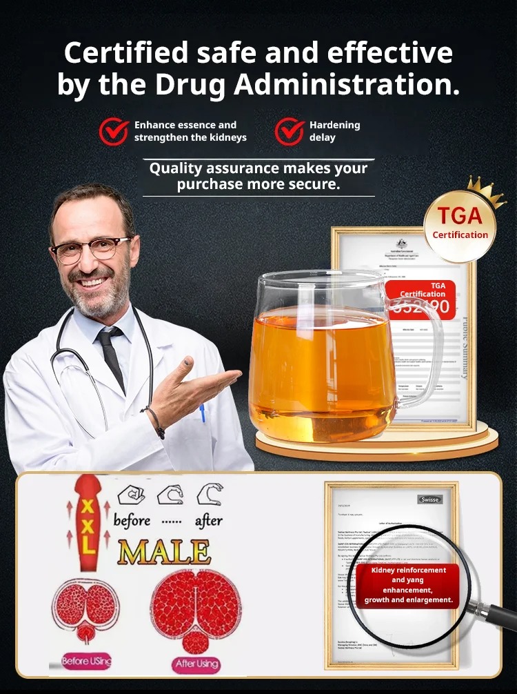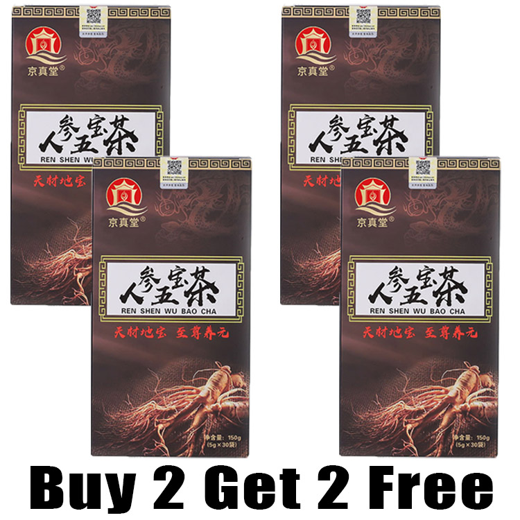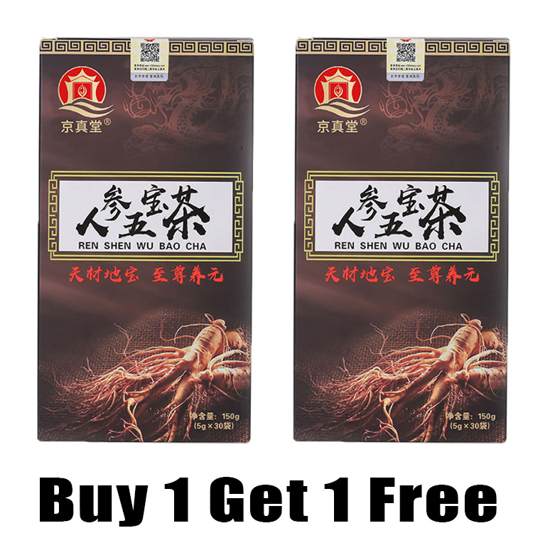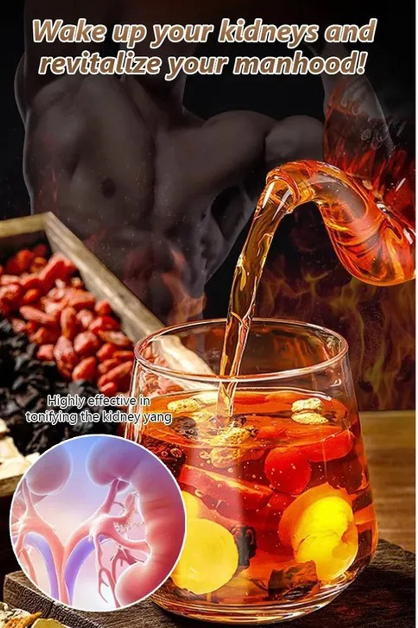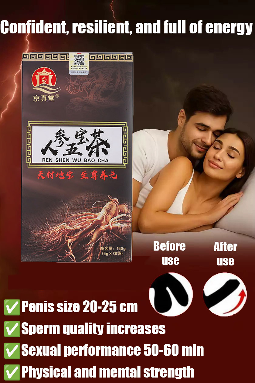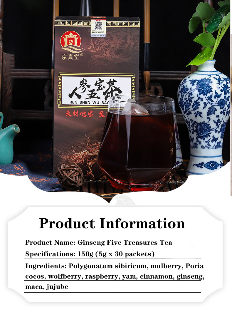شاي الجينسنغ ذو الكنوز الخمسة، وهو شاي مغذي للكلى مخصص للرجال./Ginseng Five Treasures Tea, a kidney-nourishing tea specifically for men.